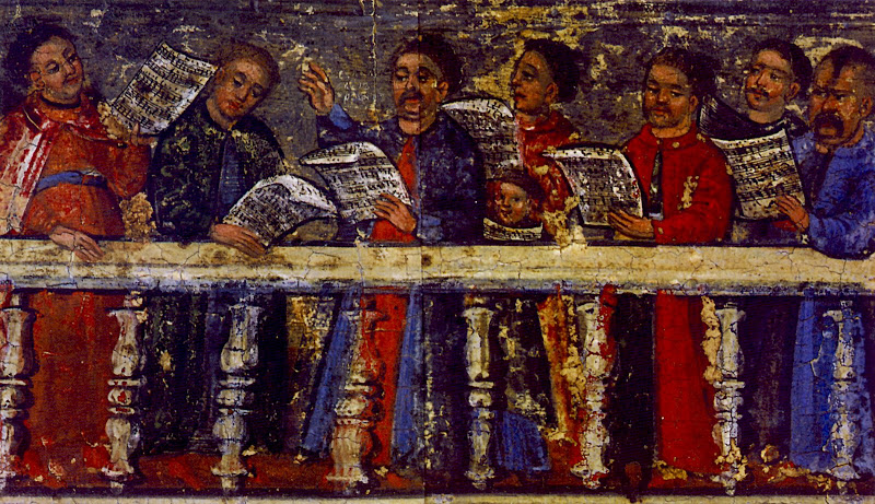 «Воздвиження Чесного Хреста з родиною Яна Собеського». Хористи. Фрагмент ікони 1670-80 рр. Львівський національний музей. Зверніть увагу – вони співають по нотам.
