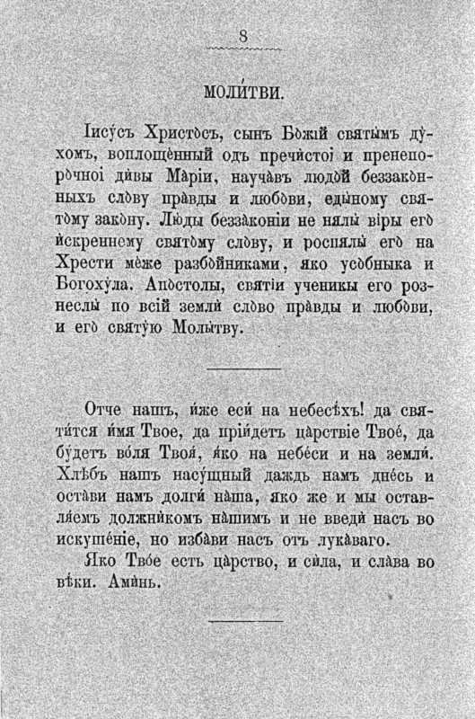 Отче наш, що єси на небесах! Нехай святиться ім’я Твоє; нехай буде воля Твоя, як на небі, так і на землі; хліб наш насущний дай нам сьогодні; і прости нам провини наші, як і ми прощаємо винуватцям нашим; і не введи нас у спокусу, але визволи нас від лукавого. Бо Твоє єсть Царство й сила, і слава, Отця й Сина і Святого Духа, нині й повсякчас, і на віки вічні. Амінь.