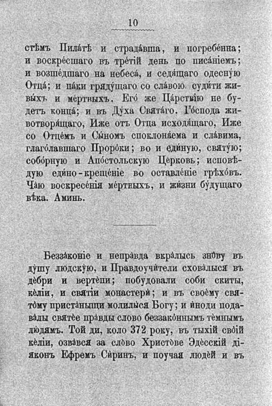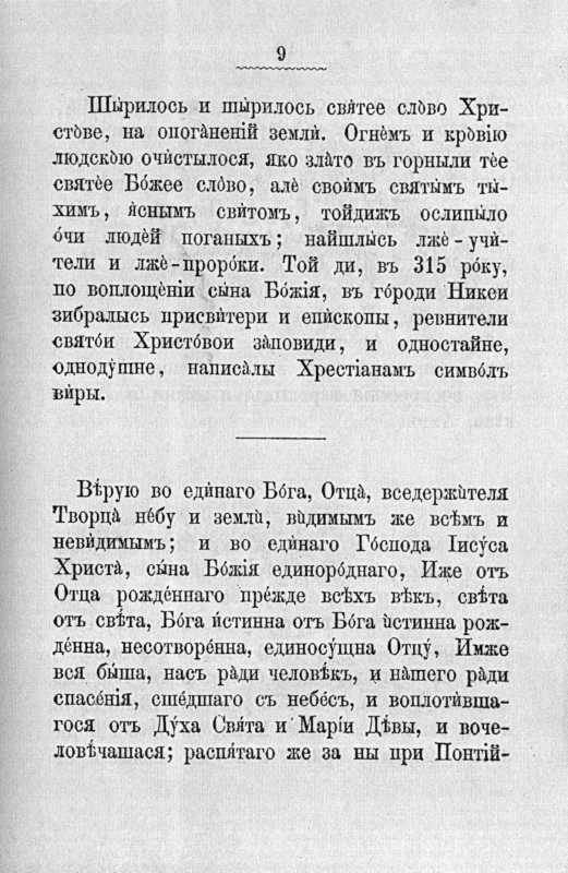 Вірую в єдиного Бога Отця, Вседержителя, Творця неба і землі, всього видимого й невидимого. І в єдиного Господа, Ісуса Христа, Сина Божого, Єдинородного, від Отця рожденного перше всіх віків. Світло від Світла, Бога істинного, рожденного, несотворенного, одноістотного з Отцем, через якого все сталося. Він для нас, людей, і для нашого спасіння з небес зійшов і тіло прийняв від Духа Святого й Марії Діви, і став людиною. І розп’ятий був за нас при Понтійському Пілаті, і страждав, і був похований. І воскрес на третій день, як було написано. І вознісся на небо, і сидить праворуч Отця. І знову прийде у славі судити живих і мертвих, і Царству Його не буде кінця. І в Духа Святого, Господа Животворчого, що від Отця ісходить, що з Отцем і Сином рівнопоклоняємий і рівнославимий, що говорив через пророків. В єдину, Святу, Соборну й Апостольську Церкву. Визнаю одно хрещення на відпущення гріхів. Сподіваюсь воскресіння мертвих і життя майбутнього віку. Амінь.