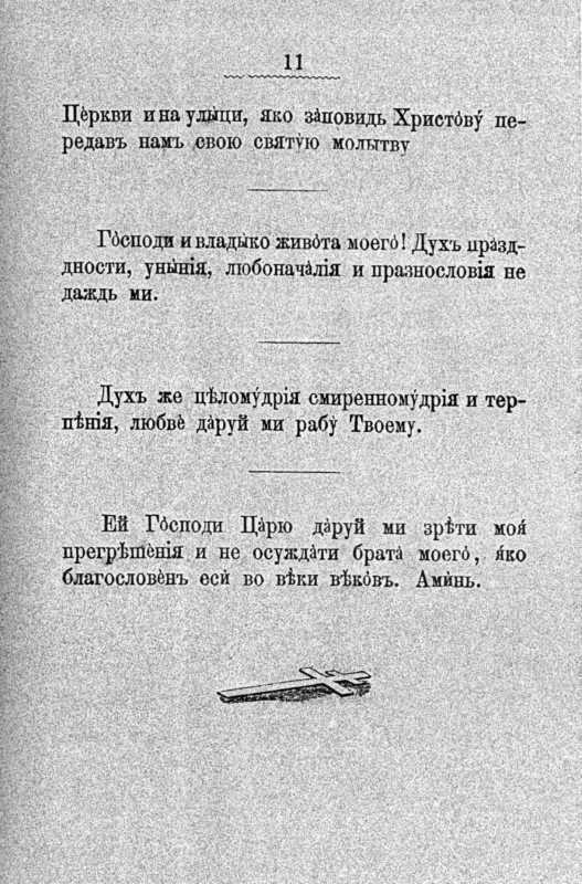 Господи, Царю, даруй мені бачити мої прогрішення і не осуджувати брата мого, бо благословен є во віки віків. Амінь.