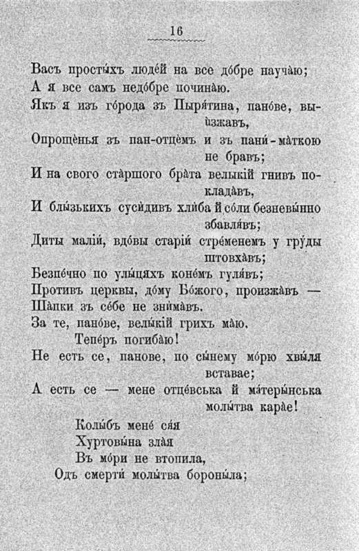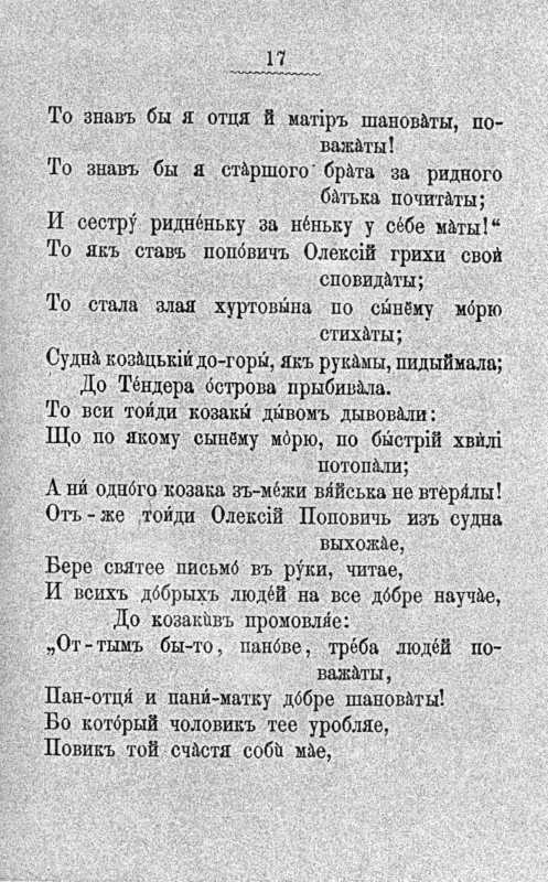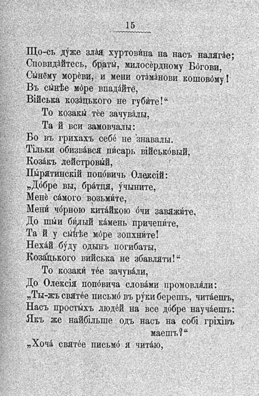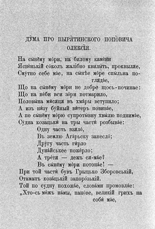 «Дума про пирятинського поповича Олексія». – Текст думи, можливо, взято зі збірки М. Максимовича «Сборник украинских песен» (Киев, 1849. – С. 49–52), де вона має заголовок «Черноморская буря». Дума записана М. Максимовичем у 30-х роках XIX ст. в Полтавській губернії.
