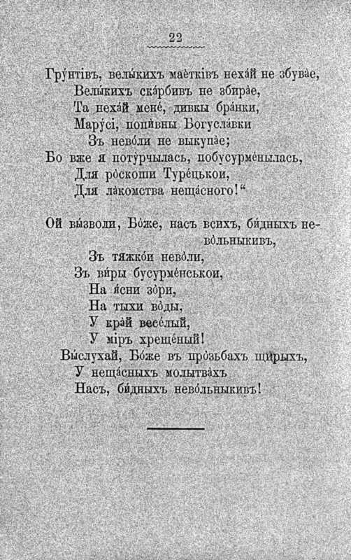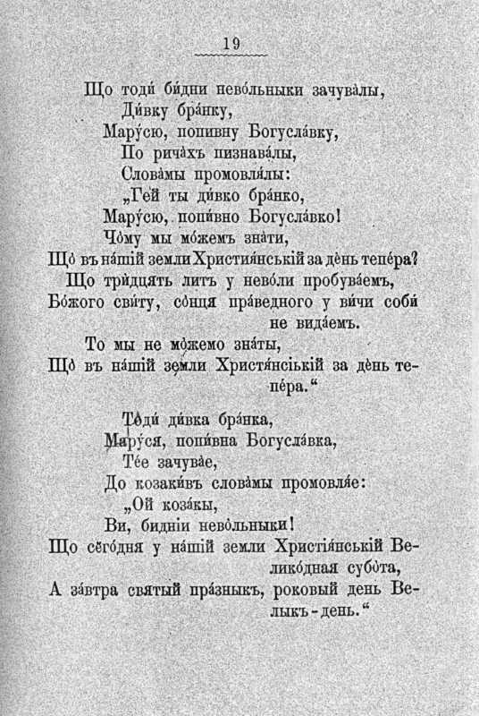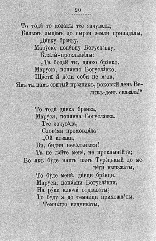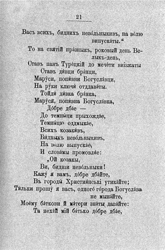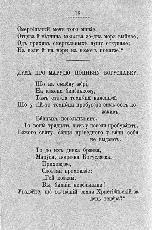 «Дума про Марусю попівну Богуславку». – Текст думи, можливо, взято зі збірника П. Куліша «Записки о Южной Руси» [СПб., 1856. – С. 210–214], де вона має заголовок «Дума о Марусе Богуславке». Думу записав М. В. Ніговський від кобзаря Ригоренка на Харківщині в першій половині 1850-х років.